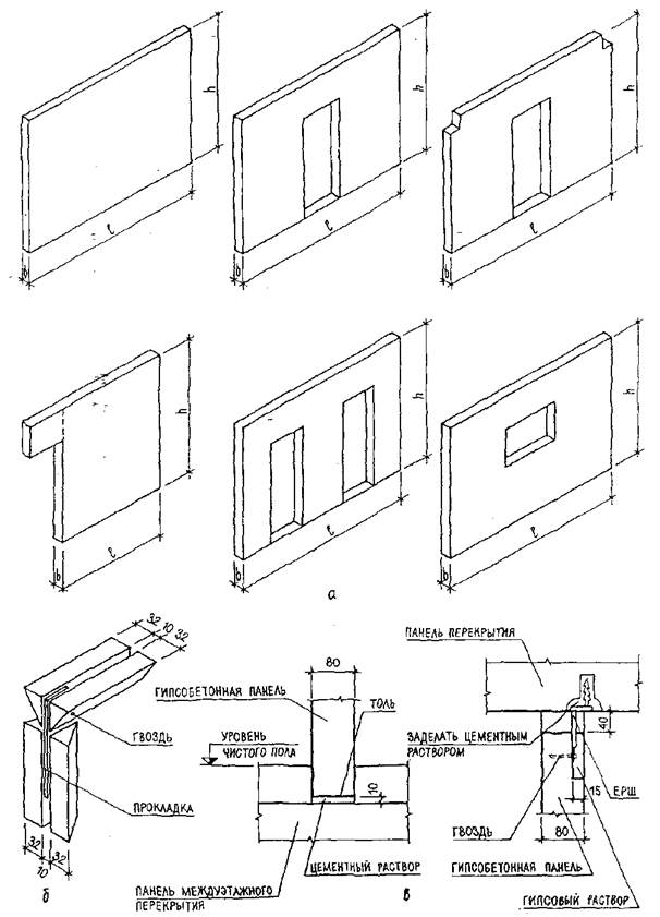 а – панели; б – узел деревянного каркаса панели; в – примыкание панелей перегородок к панелям перекрытия