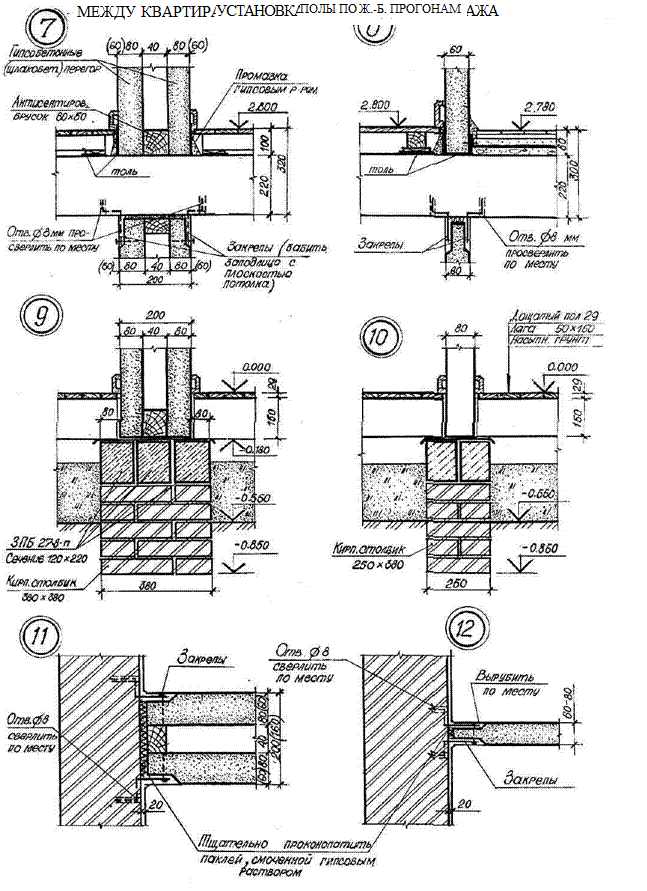 а – крепление кирпичной перегородки к стене; б – схема расположения мест крепления перегородки к стенам и перекрытию; в – узел крепления перегородки к перекрытию; г – крепление перегородок из гипсовых плит к стене при помощи анкера; д – то же, спаренных при помощи ершей; е – то же, из гипсовых плит, стыкуемых перпендикулярно; ж – узел стыка кирпичной и столярной перегородок; то же, и стеклоблочные перегородки.