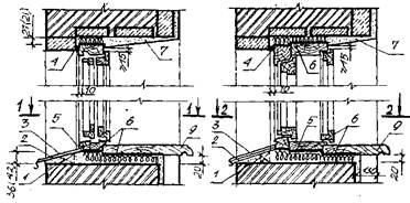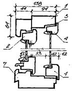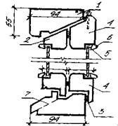 | 1 – коробка; 2 – переплет; 3 – упругая прокладка; 4 – наплыв; 5 – замазка; 6 – деревянный штапик; 7 – прорезь для отвода воды | |||