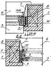 | 1 – деревянная антисептированная пробка; 2 – стальной костыль; 3 – слив из оцинкованной кровельной стали; 4 – герметик; 5 – конопатка; 6 – рубероид; 7 – штукатурка; 8 = ерш; 9 – подоконная доска; 10 – антисептированные доски при зазоре больше 35 мм | |||||