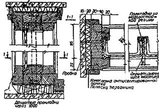 | 1 – конопатка; 2 – толь; 3 – штукатурный слой; 4 – костыль; 5 – антисептированные деревянные пробки размером с кирпич | ||||