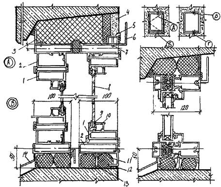 | 1 – переплет створки; 2 – коробка; 3 – утеплитель; 4 – штукатурка; 5 – стальная пружина; 6 – нащельник; 7 – самонарезающий винт; 8 – стекло; 9 – уплотнитель; 10 – штапик; 11 – эластичная прокладка; 12 – мастика; 13 – смоляная пакля; 14 – слив; 15 – термовкладыш; 16 – комбинированный переплет; 17 - стеклопакет |