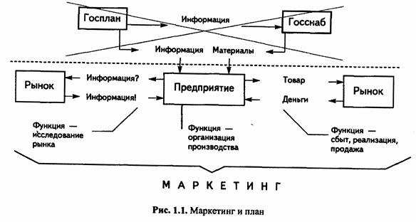 Глубже познать природу маркетинга, его содержание и сущность, а также ответить еще на один вопрос: стоит ли внедрять его в функциональную структуру управления российскими предприятиями — можно на сопоставлении того, что в управлении производством было у нас до реформы, и того, что у нас должно произойти (и происходит) сейчас, в ходе реформы. Такое сопоставление представим на рис. 1.1.