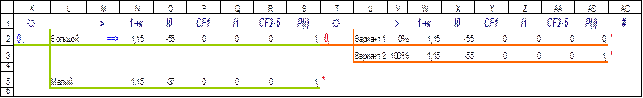 4. Замените названия ветвей во введенной развилке решений (ячейки L2:L3) соответственно на «Большой» и «Малый», в колонке I0 введите величины первоначальной инвестиции -55 (в ячейку O2) и -37 (в ячейку O3), поставьте курсор на верхнюю из двух звездочек (в ячейку T1) и вставьте развилку ‘Варианты будущего’. Лист будет выглядеть следующим образом: