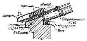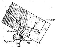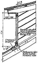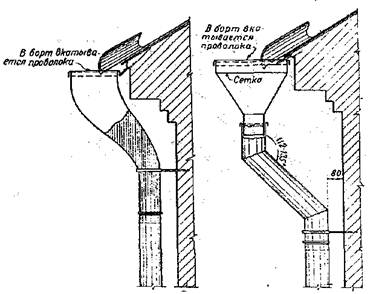 Наружные водостоки состоят из воронки, подлеечного колена и трубы с отметом. Расстояние между трубами не более 20м (из расчета на 1 м2 поверхности ската кровли 1-2 с м2 сечения водосточной трубы). Водосточные трубы крепят к стенам при помощи стальных ухватов или хомутов.
