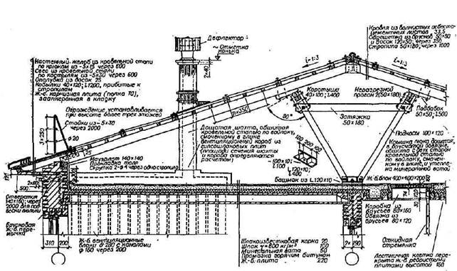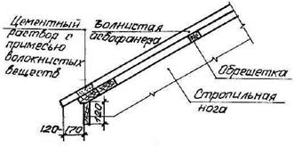 КРОВЛЯ ИЗ ВОЛНИСТЫХ АСБЕСТОЦЕМЕНТНЫХ ЛИСТОВ ПО ДОЩАТЫМ СТРОПИЛАМ, ОПИРАЮЩИМСЯ НА ПРОДОЛЬНЫЕ СТЕНЫ.