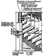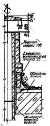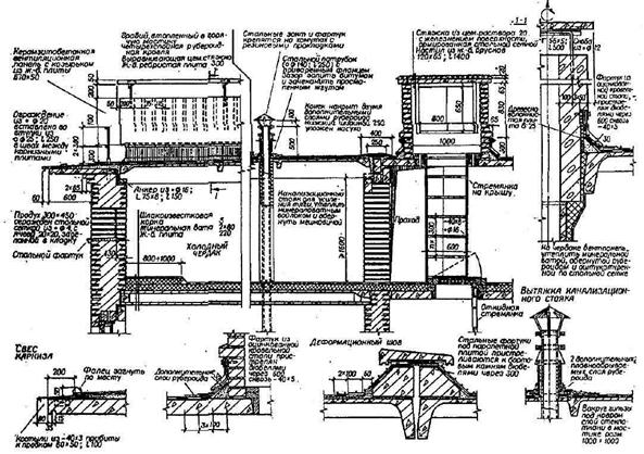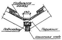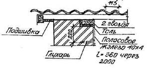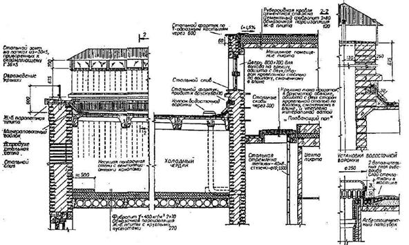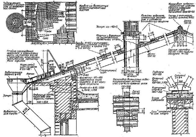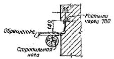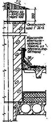 | д – деталь наружного организованного водостока при рубероидной крыше | е – узел примыкания кровли к вертикальному ограждению | |