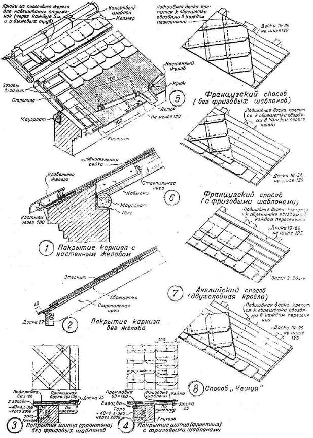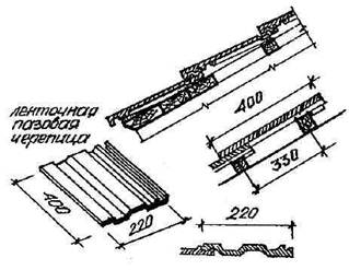 Наибольшее распространение имеет пазовая штампованная и плоская ленточная черепица. Ее укладывают по обрешетке сечения 50 на 50 (рис.79.).