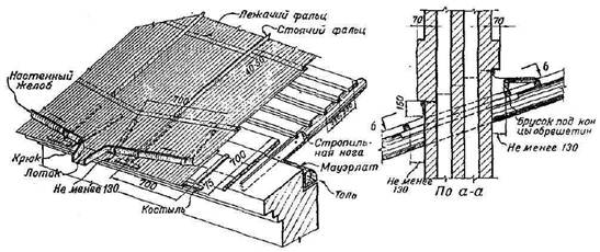 | Покрытие карниза с настенным желобом | Конек с кровельным железом |