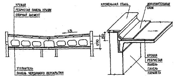 | а - крыша из ребристых панелей с поперечными опорными элементами | б – примыкание крыши из ребристых панелей к парапету |