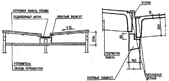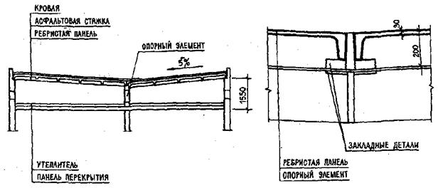 | в – крыша из ребристых панелей с продольными опорными элементами | г – вариант опирания ребристых панелей крыши на опорные элементы |