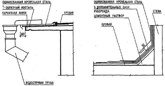 | ПОКРЫТИЕ КАРНИЗА С НАСТЕННЫМ ЖЕЛОБОМ | ПОКРЫТИЕ КАРНИЗА БЕЗ ЖЕЛОБА |