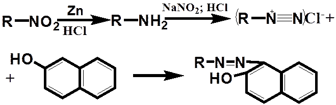 2) Реакция на NO2, которую восстанавливают Zn пылью в присутствии HCl, затем диазотируют ароматическую аминогруппу NaNO2 образуется хлористая соль диазония, которую сочетают с щелочным раствором β-нафтола образуется азокраситель розового цвета.