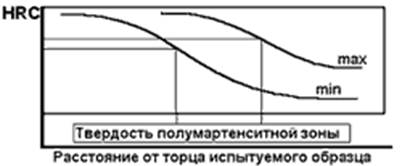 Измерив твердость по длине, строят зависимость твердости от расстояния от закаленного торца. В ГОСТах приведены кривые прокаливаемости на базе из 100 и более плавок одной марки стали, указываются верхний и нижний пределы. Рис. 46. За границу между закаленной и незакаленной зонами понимают полумартенситный слой (50% мартенсита + 50% троостита). Прокаливаемость учитывают при выборе марки стали.