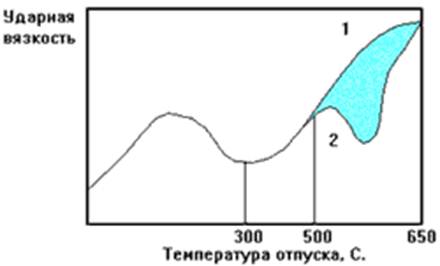 Рис. 47.1. Влияние отпуска на ударную вязкость легированной стали (схема): 1 - быстрое охлаждение; 2 - медленное охлаждение.