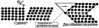 Под действием внешних сил металл изменяет свою форму. Это изменение состоит из двух частей: упругой или обратимой, исчезающей после снятия нагрузки, и необратимой, пластической, остающейся после снятия нагрузки. При упругой деформации расстояние между атомами изменяется: увеличивается или уменьшается. После снятия нагрузки атомы возвращаются на прежние места. При пластической деформации части кристалла перемещаются друг относительно друга необратимо, путем сдвигов или скольжений и двойникования. Скольжение или сдвиги - параллельное смещение тонких слоев металла и одновременно поворот их.