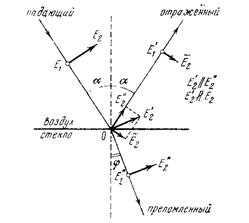 Рассмотрим поляризацию света при отражении и преломлении от диэлектрика. Естественный свет, падающий на диэлектрик, представим как наложение линейно поляризованных волн во взаимно перпендикулярных плоскостях с беспорядочно меняющейся разностью фаз. Одна волна будет поляризована в плоскости падения, ее мы будем называть скользящей составляющей, а другая поляризована перпендикулярно плоскости падения, это скользящая составляющая. При падении естественной волны на диэлектрик образуются две волны: отраженная и преломленная (см рис.12.1). Если угол падения света на границу раздела двух диэлектриков (например, на поверхность стеклянной пластинки) отличен от нуля, отраженный и преломленный лучи оказываются частично поляризованными. В отраженном луче преобладают колебания, перпендикулярные к плоскости падения (на рис. 12.1 эти колебания обозначены точками), в преломленном луче — колебания, параллельные плоскости падения (на рисунке они изображены двусторонними стрелками). Обозначим через