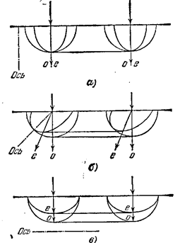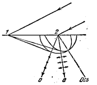 Ход обыкновенного и необыкновенного лучей в кристалле можно определить с помощью принципа Гюйгенса. На рис. 12.7 построены волновые поверхности обыкновенного и необыкновенного лучей с центром в точке 2, лежащей на поверхности кристалла. Построение выполнено для момента времени, когда волновой фронт падающей волны достигает точки 1. Огибающие всех вторичных волн (волны, центры которых лежат в промежутке между точками 1 и 2, на рисунке не показаны) для обыкновенного и необыкновенного лучей, очевидно, представляют собой плоскости. Преломленный луч обыкновенный или необыкновенный, выходящий из точки 2, проходит через точку касания огибающей с соответствующей волновой поверхностью. Напомним, что лучами называются линии, вдоль которых распространяется энергия световой волны Из рис. 12.7 следует, что обыкновенный луч о совпадает с нормалью к соответствующей волновой поверхности. Необыкновенный же луч е заметно отклоняется от нормали к волновой поверхности. На рис. 12.8 изображены три случая нормального падения света на поверхность кристалла, отличающиеся направлением оптической оси. В случае а лучи о и е распространяются вдоль оптической оси и поэтому идут не разделяясь. Из рис. 12.8, б видно, что даже при нормальном падении света на преломляющую поверхность необыкновенный луч может отклониться от нормали к этой поверхности. На рис. 12.8, в оптическая ось кристалла параллельна преломляющей поверхности. В этом случае при нормальном падении света обыкновенный и необыкновенный лучи идут по одному и тому же направлению, но распространяются с разной скоростью, вследствие чего между ними возникает все возрастающая разность фаз. Характер поляризации обыкновенного и необыкновенного лучей таков же, как для лучей, изображенных на рис. 12.7.