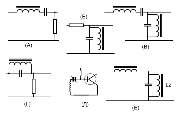 (А) - последовательный колебательный контур, (Б) - параллельный колебательный контур.