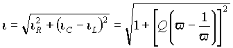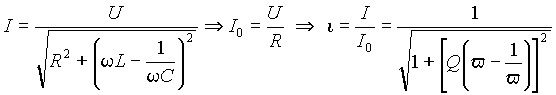 где i = I / I 0, u k = Uk / U, v = w /w 0 - соответственно ток, напряжение и частота в относительных единицах, в которых в качестве базовых величин приняты ток I 0, напряжение на входе U и частота w 0 в режиме резонанса. Абсолютный и относительный ток в контуре равен