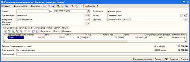 Документ не формирует проводок, однако, на его основе можно заполнить приходные кассовые или банковские документы, а так же - документ Реализация товаров и услуг. Введем этот документ на основании Счета на оплату покупателю, при выборе типа операции укажем Продажа, комиссия (рис. 13.25).