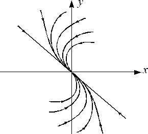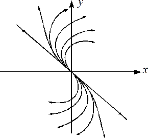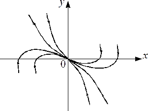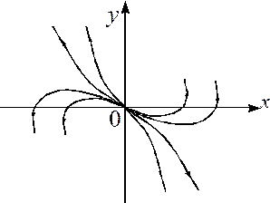 . Как и в предыдущем случае - узел, но неустойчивый. Движение происходит в направлении от точки покоя. Все интегральные кривые касаются в точке покоя (рис.8).