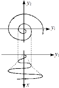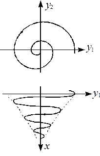 Например, пусть при решении кубического характеристического уравнения один из корней отрицателен и два других комплексно сопряжены с отрицательной действительной частью. Тогда интегральные кривые в окрестности точка покоя носят характер винтообразной спирали, направленной к точке покоя.