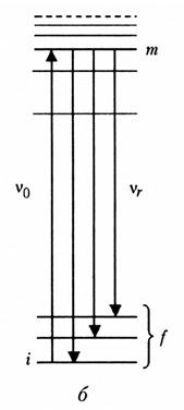 Схематическая диаграмма энергетических уровней атома или молекулы и различных процессов взаимодействия: а – широкополосная флуоресценция; б – резонансная флуоресценция; в – резонансное рассеяние