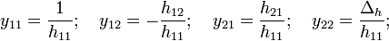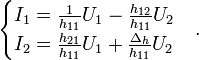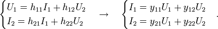 В качестве примера преобразуем h-параметры четырёхполюсника в y-параметры. Для этого нужно осуществить следующее преобразование системы уравнений:
