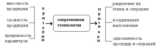 Кроме того, концепцию современной технологии характеризуют такие критерии, как массовость продукции, сложность продукции и предельность ее параметров.