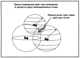 Если получены измерения с трёх спутников и все часы точные, то круг описанный радиус-вектором от третьего спутника будет пересекаться как показано на рисунке.
