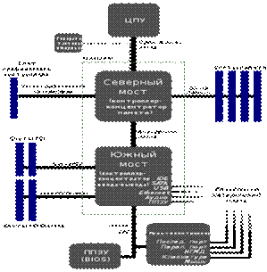 Определения «северный» и «южный» микросхемы получили из-за своего местоположения на системной плате - первый, соответственно, вверху, ближе к процессору и модулям памяти, второй внизу, в районе слотов расширения и разъемов контроллера IDE. Что касается слова «мост» (реже употребляют еще слово «магистраль») - то набор из этих двух микросхем представляет собой как бы систему мостов, объединяющих все контроллеры и периферийные устройства. К шине подключаются адаптеры или контроллеры, служащие для согласования работы устройства с остальными блоками ПК.