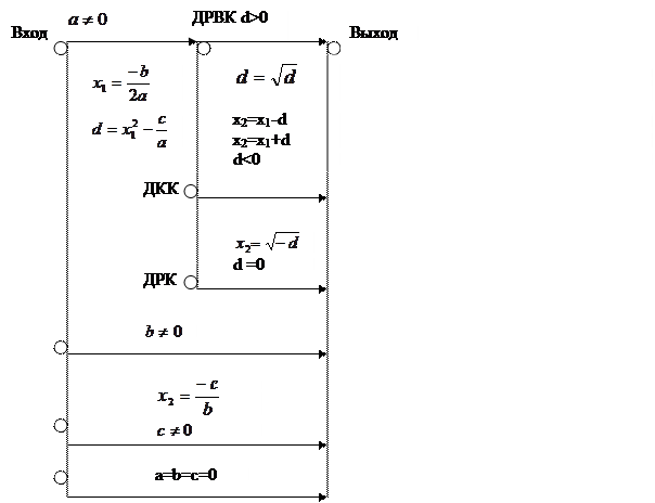 | ДКК | d<0 | х2= sqrt(-d) | Выход |