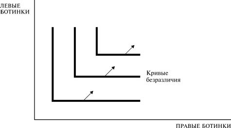 Таким образом, кривые безразличия имеют форму буквы L с вершиной в точке, где количество левых ботинок равно количеству правых ботинок, как на рис.