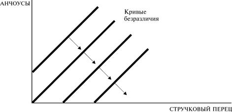 Безразличное благо. Потребитель любит стручковый перец, но равнодушен к анчоусам, поэтому кривые безразличия представляют собой вертикальные линии.