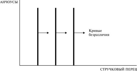 В этом случае кривые безразличия для данного потребителя будут вертикальными линиями, подобными изображенным на след.рис.. Потребителя волнует лишь количество имеющегося у него стручкового перца и совершенно не волнует, сколько у него имеется анчоусов. Чем больше стручкового перца, тем лучше, добавление же анчоусов никак не влияет на его благосостояние.