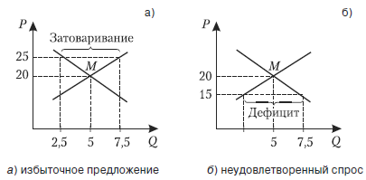 Так, если цена будет выше равновесной (25 единиц), то произойдет превышение предложения над спросом и как результат – затоваривание (рис. 7.5, а). Обратная ситуация приведет к дефициту (рис. 7.5, б).