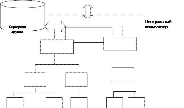 На самом высшем уровне находится центральный коммутатор, посредством которого происходит объединение сети.
