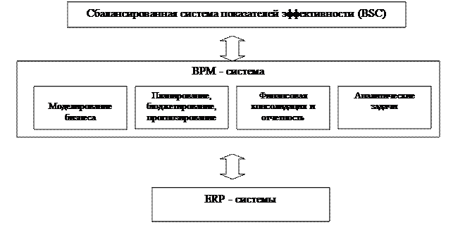 Информационные BPM- системы, позволяющие реализовать методы BSC, представляют собой настройку над ERP – системами и интегрируют получаемую от ERP- систем информацию для решения задач анализа и стратегического планирования. Типовая архитектура информационной BPM – системы показана на рис.3.