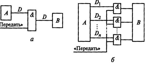При передаче одноразрядных данных (см. рис. 2.11, а)один вход элемента И является информационным, а второй – управляющим. На информационный вход поступают одноразрядные данные D от источника A. Если на управляющем входе сигнал «Передать» равен «0», то на приемник В поступает сигнал «0» независимо от значения данных D. Если сигнал «Передать» равен «1», то сигнал на выходе элемента И совпадает с информационным сигналом и на вход приемника поступают данные D.