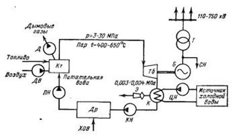 Охлаждающая вода с источника холодной воды подается в конденсатор циркуляционными насосами ЦН. Воздух, попадающий в конденсатор через неплотности, удаляется с помощью эжектора Э. Конденсат, образующийся в конденсаторе, с помощью конденсатного насоса КН подается в деаэратор ДР, который предназначен для удаления из питательной воды газов и, в первую очередь, кислорода, вызывающего усиленную коррозию труб котла. В деаэратор также подается химически очищенная вода. После деаэратора питательная вода, предварительно подогретая в подогревателях и экономайзере (хвостовой части) котла, питательным насосом ПН подается в котел. Пропуск основной массы пара через конденсатор приводит к тому, что 60— 70 % тепловой энергии, вырабатываемой котлом, бесполезно уносится циркуляционной водой.
