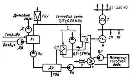 На ТЭЦ, в отличии от КЭС, имеются значительные отборы отработанного пара на производственные и коммунально-бытовые нужды. Коммунально-бытовые потребители обычно получают тепловую энергию от сетевых подогревателей (бойлеров) СП. При снижении электрической нагрузки ТЭЦ ниже мощности на тепловом потреблении необходимая для потребителей тепловая энергия может быть получена с помощью редукционно-охладительной установки РОУ, питающейся острым паром котла. Чем больше отбор пара из турбины для теплофикационных нужд, тем меньше тепловой энергии уходит с циркуляционной водой и, следовательно, тем выше КПД электростанции. Следует, однако, отметить, что во избежание перегрева хвостовой части турбины через нее должен быть обеспечен во всех режимах пропуск определенного количества пара.