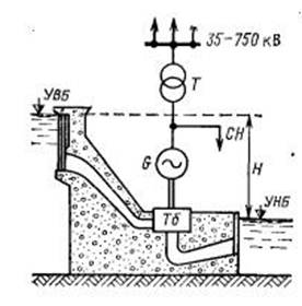 Мощность ГЭС зависит от расхода воды через турбину и напора H (рис. 1.4). Эта мощность, кВт, определяется выражением