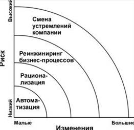 Более глубокая форма организационного изменения, уже затрагивающая структуру производства, - рационализация рабочих процедур или улучшение процессов (Business Process Improvement - BPI). Для наведения порядка в сложных и распределенных процедурах и процессах необходимо изменять порядок их выполнения. Суть изменений - рациональное выстраивание технологических процедур, экономия процессного пространства и времени. Рационализация также не привносит большого дополнительного риска, так как она может начинаться с локальных процедур и процессов и только после получения экономического эффекта распространяться на все предприятие.