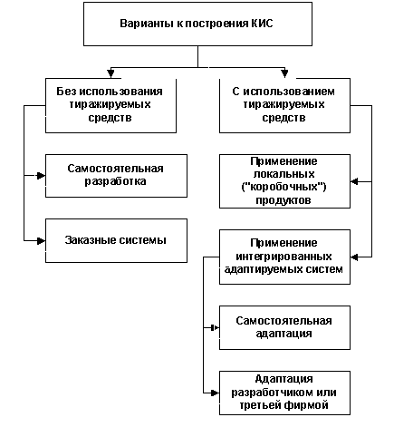 В настоящее время существуют различные подходы к построению КИС, отличающиеся признаками, положенными в основу классификации. С практической точки зрения нам представляется целесообразным взять за основу классификации этих подходов признак использования тиражируемых программных средств. Полученная таким образом схема классификации подходов к построению КИС приведена на рис. 3.1.