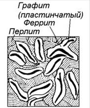 Структура состоит из металлической основы с графитом пластинчатой формы, вкрапленным в эту основу. Весь углерод или большая часть находится в свободном состоянии в виде графита, а в связанном состоянии находится не более 0,8 % углерода.