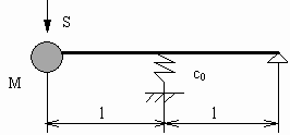 Пусть 2l - длина балки, с0 - коэффициент жесткости пружины. Один конец балки закреплен на шарнире, расположенном на неподвижной опоре: