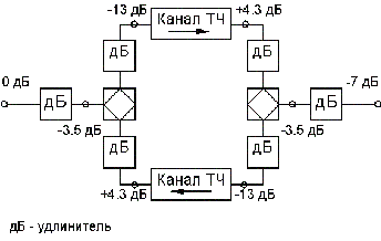 Телефонный канал включает в себя двухпроводное окончание и четырехпроводный тракт. Дифсистема (ДС) служит для перехода с четырехпроводного тракта к двухпроводному окончанию. Удлинители в двухпроводном окончании имеют затухание 3.5 дБ и называются транзитными. Характеристики канала ТЧ нормируются рекомендациями МСЭ-Т серии М.
