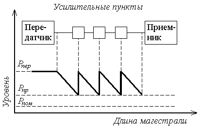 В системах передачи применяется способ компенсации затухания сигналов повышением мощности сигнала в нескольких равномерно расположенных точках тракта. Часть канала связи между соседними промежуточными усилителями называется усилительным участком. Изменение уровней сигнала вдоль магистрали описывается диаграммой уровней, приведенной на рисунке 3.3.