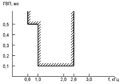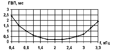 Фазочастотные искажения не являются столь существенным при передаче речи. Но так как каналы ТЧ используются также для передачи данных и факсимильной связи, большие фазочастотные искажения недопустимы. Поэтому нормируется отклонение группового времени передачи (ГВП) от его значении на частоте 1900 Гц на одном транзитном участке длиной 2500 км (рисунок 3.5).